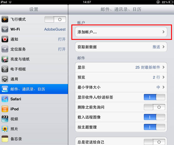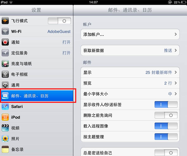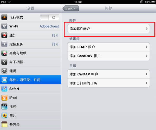 1、首先打开iPad,进入"设置"中的"邮件、通讯录、日历"选项。