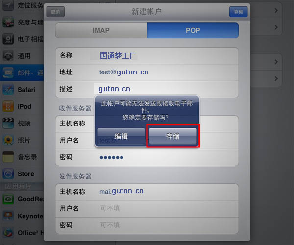 5、填写后点击"存储",等一会,屏幕会跳出SSL连接的提示,点击"否":