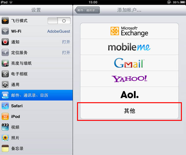 2、点击"添加帐户",将出现以下界面,再点击"其他",再点击"添加邮件账户"