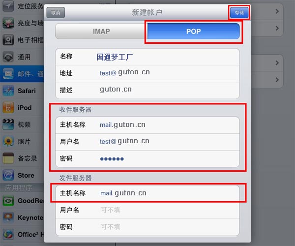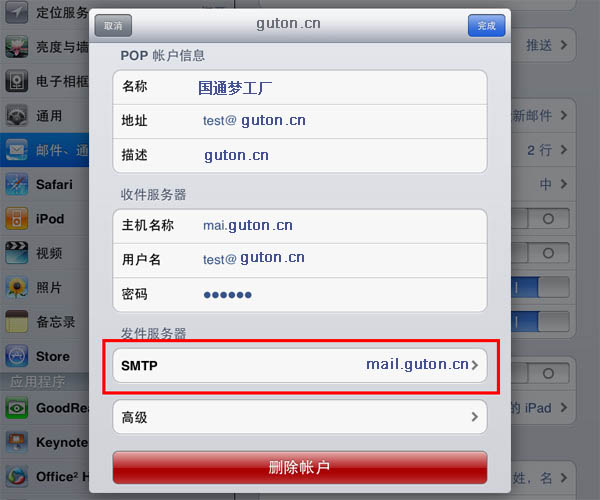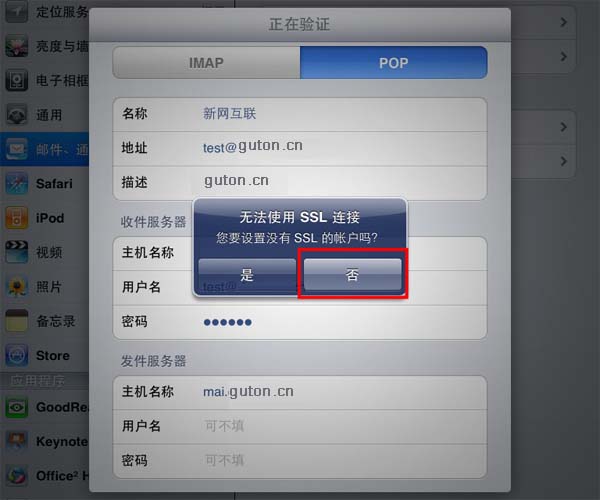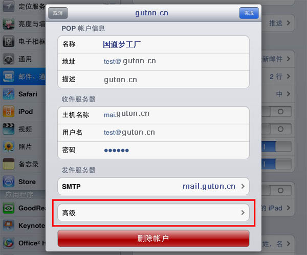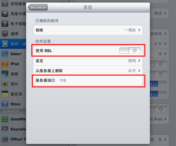 10、同样,在"高级"选项下,将收件服务器端口修改为:110,并同时关闭"使用SSL"。正常情况下,iPad会直接成功连接上的你的企业邮箱。