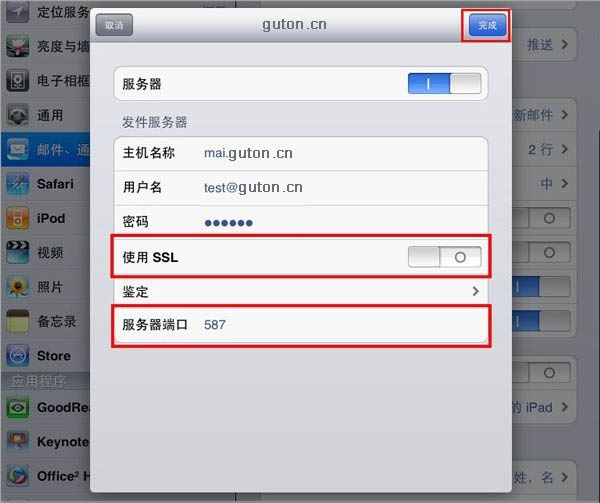 9、使用默认"服务器端口587",并同时关闭"使用SSL",并点击右上边"完成"。